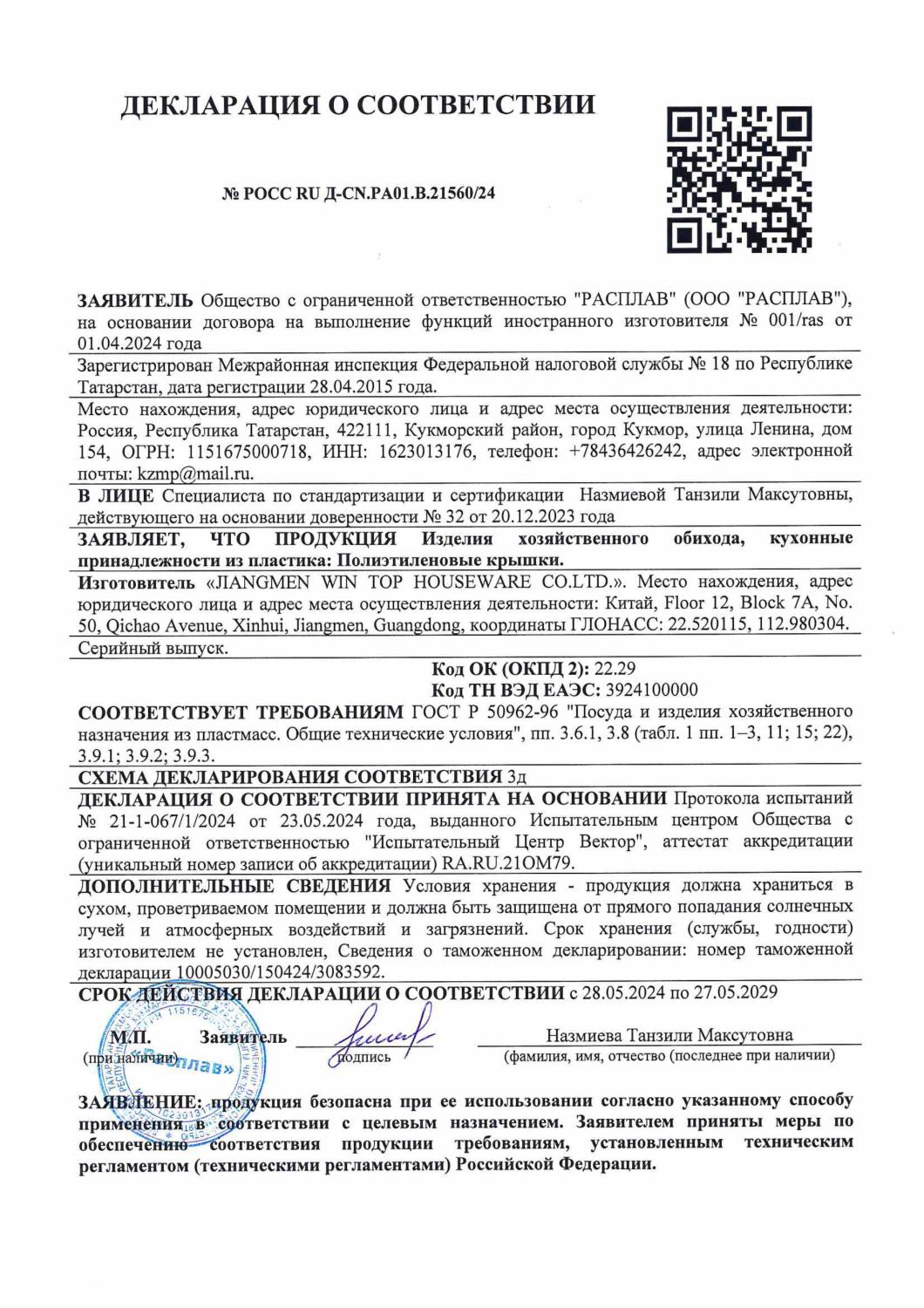 Декларация на пластмассовые крышки