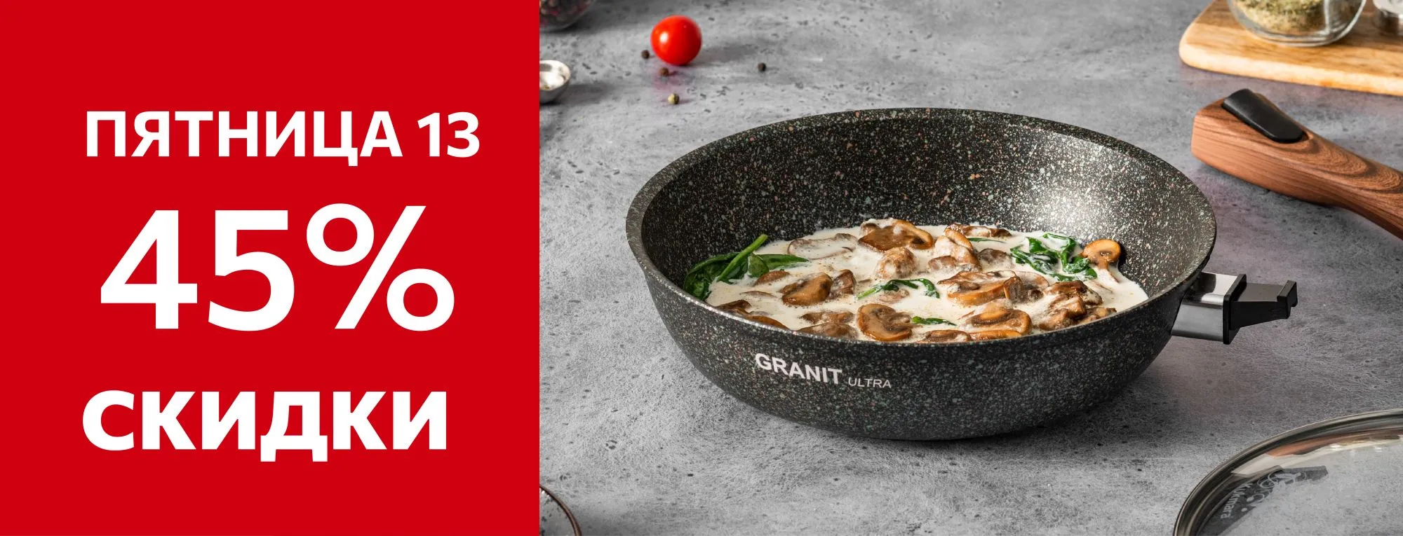 7 изделий из коллекции Granit ultra (black-gold) — казаны, кастрюли и сковороды с ручками и съемными ручками с мистическим чёрно-золотым сиянием. Их антипригарное покрытие словно древнее заклинание: ничего не пригорает, всё получается идеально.
