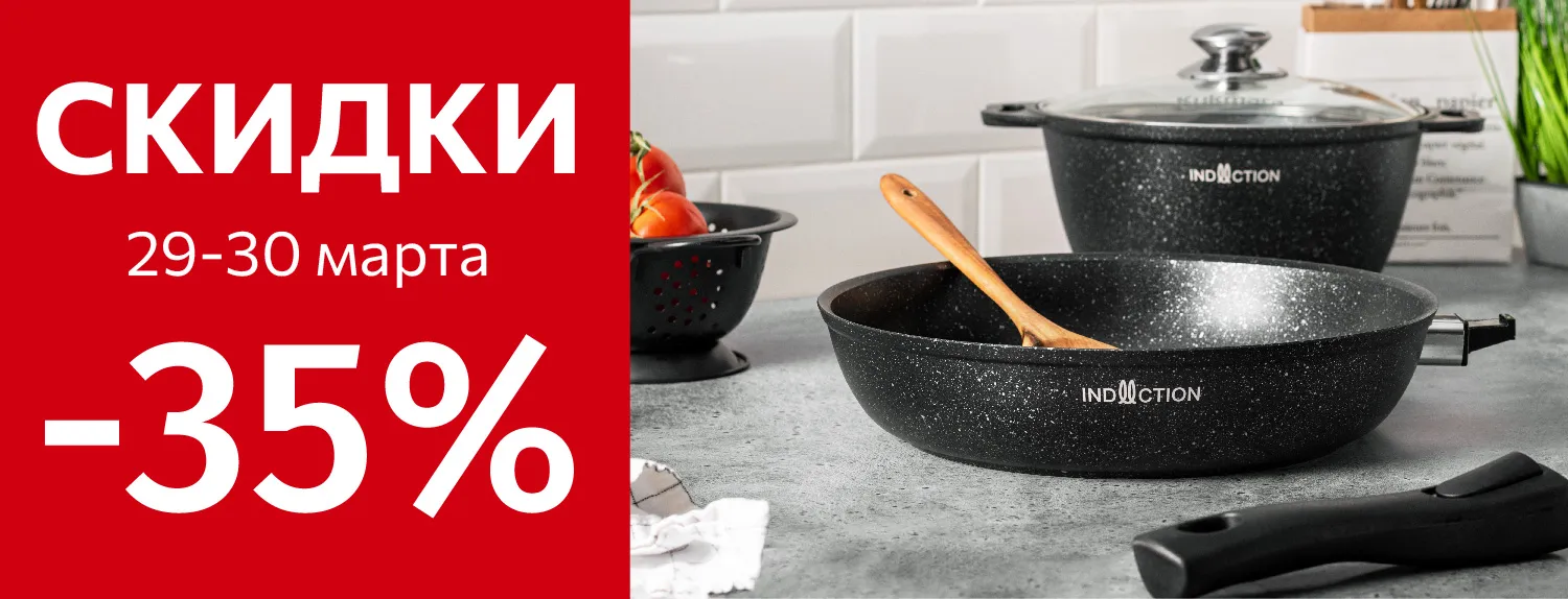 -35% на посуду с антипригарным покрытием коллекции «Традиция», «Мраморная», «Marble Induction» и блинницы «Granit».
