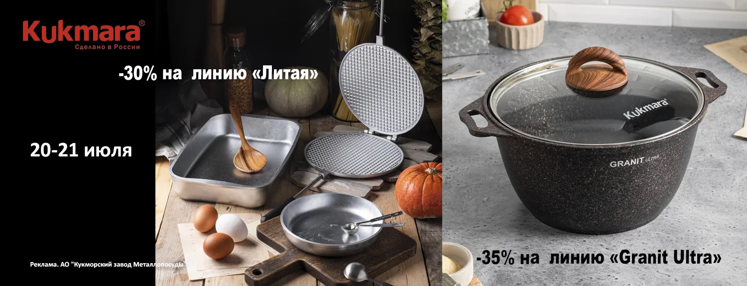 Kukmara всегда заботится о том, чтобы Вы могли приобретать проверенную годами посуду по приятным ценам! На этот раз жребий выпал на любимые коллекции «Granit Ultra» и «Литая»!